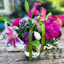 The arrangement design will replicate the color palette and silhouette as shown. Every effort will be made to duplicate the content. Market/ seasonal availability will be the determining factor regarding specific flower inclusion.
