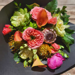 The arrangement design will replicate the color palette and silhouette as shown. Every effort will be made to duplicate the content. Market/ seasonal availability will be the determining factor regarding specific flower inclusion.