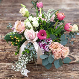The arrangement design will replicate the color palette and silhouette as shown. Every effort will be made to duplicate the content. Market/ seasonal availability will be the determining factor regarding specific flower inclusion.