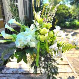 The arrangement design will replicate the color palette and silhouette as shown. Every effort will be made to duplicate the content. Market/ seasonal availability will be the determining factor regarding specific flower inclusion.